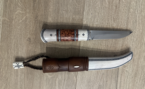 Пришёл саамский нож от мастера Игоря Баруткина из Ловозера. Материалы - олений рог, стабилизированная карелка. Клинок Алексея Скрыльникова. Кто знает, тот поймёт. 109