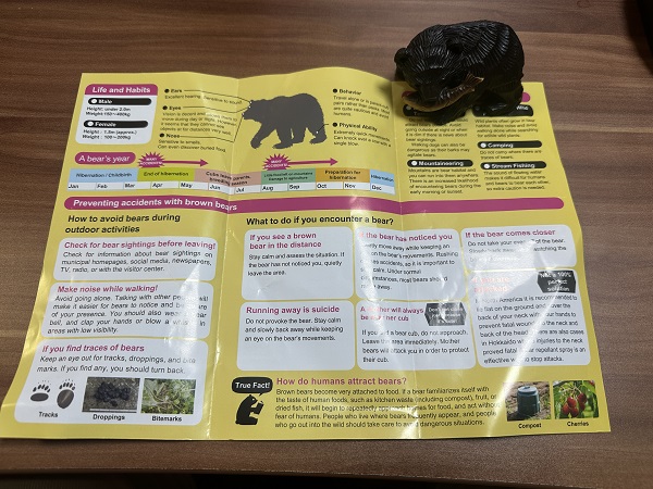 Моя хорошая приятельница съездила на Хоккайдо и привезла мне медвежий сувенир. Вместе с инструкцией по технике безопасности от медведей на английском языке (ибо для туристов).