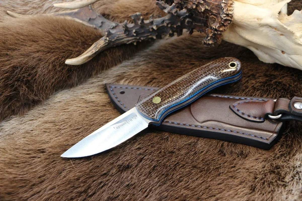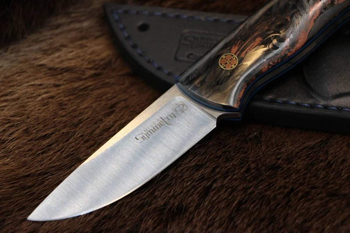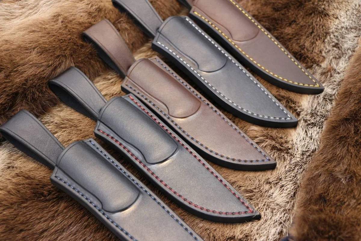 Материалы для рукояти используем разные: микарту, авторские композиты (смолу с застывшими в ней различными элементами дизайна – натуральным мхом, шишками, сотами и др.), карбон, стабилизированное дерево. Опять же, есть материал, который больше подходит для той или иной модели ножа и серии в целом. На рукоятях используем пины трёх видов – стандартные, мозаичные и авторские. В нашем случае пин – это не только скрепляющий штифт, но и отличный элемент дизайна. Ножны для всех моделей на данный момент изготавливаются из натуральной кожи растительного дубления толщиной 3,6–4,0 мм. Ножны имеют различные подвесы, для каждой модели свой: где необходимо – комбинированный, а где-то – свободный или фиксированный. Как и ножи, ножны тоже полностью ручной работы, с силовой формовкой и ручным швом.