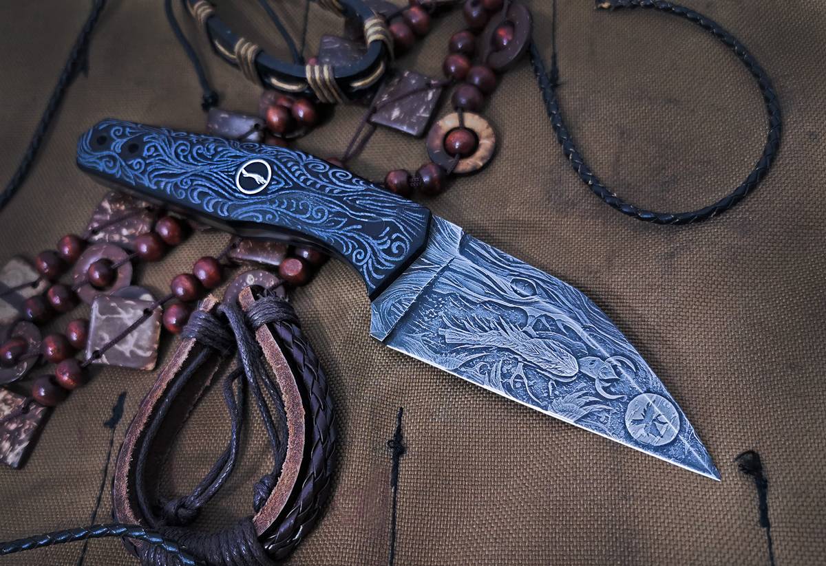Отличия, прежде всего, в исполнении: рельефном травлении глубокой детализации в вышеописанном стиле и строгих чёрных рукоятях. Да, «Волчий Век» известен своими яркими кастомными изделиями, но эти ножи у них получились совсем другими. Впрочем, ножи этой линейки тоже вышли яркими, просто по-своему – с какой-то особенной суровостью и глубиной.