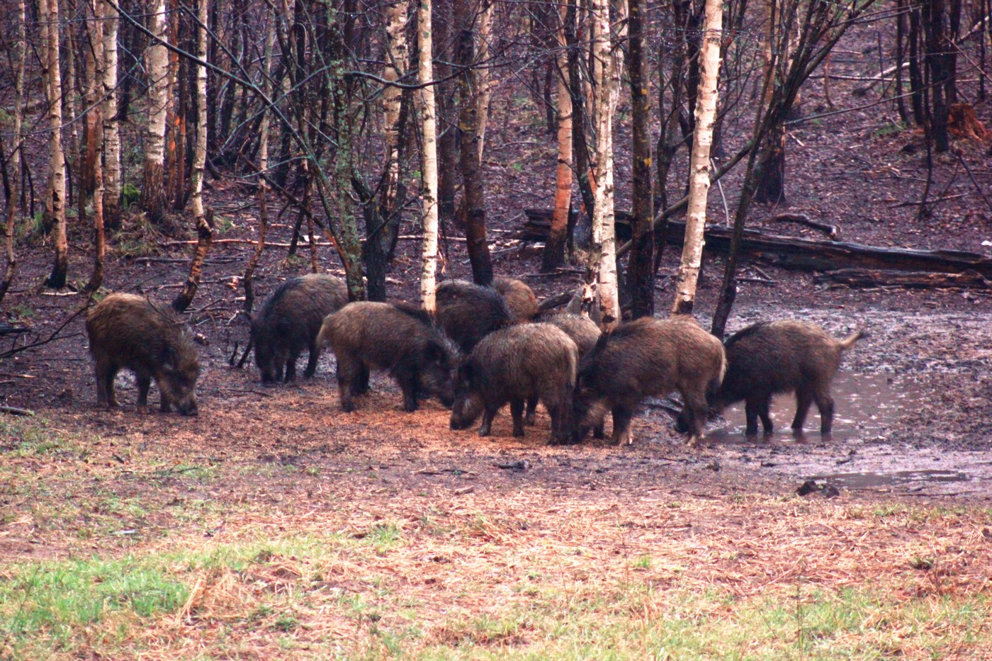 Итак, в самом начале пятого часа вечера, поплутав на двух машинах с полчаса по лесным дорогам – мокрым, но, в силу песчаного состава, вполне проходимым для моего паркетника, мы остановились на поляне. Отсюда надо было ещё около километра идти пешком. Сотрудник хозяйства провожает меня до лабаза и, ещё раз кратко напомнив про технику безопасности, уходит. При подходе, кстати, страгиваем кабанов, уже крутившихся вокруг кормушки.