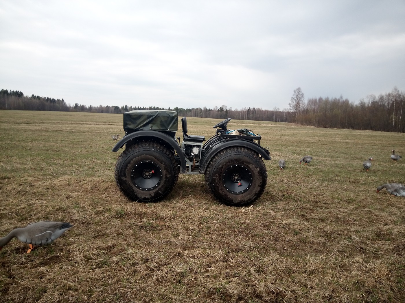 По езде. Задний мост качается, что для переломок очень важно. В целом за счёт больших и очень мягких колёс ощущения на любых грунтах, что едешь на гусеницах. Всё очень мягко, комфортно и т. д. По габаритам – большой квадрик, и габаритная проходимость по лесу, болоту, вообще везде – уникальная. Если большие вездеходы местами просто не могут съехать с «дороги» – зимника, просеки или прорубленного пути, – то на «Литле» это делается без проблем. Первые ходовые испытания я устроил весной на пруду в Подмосковье.