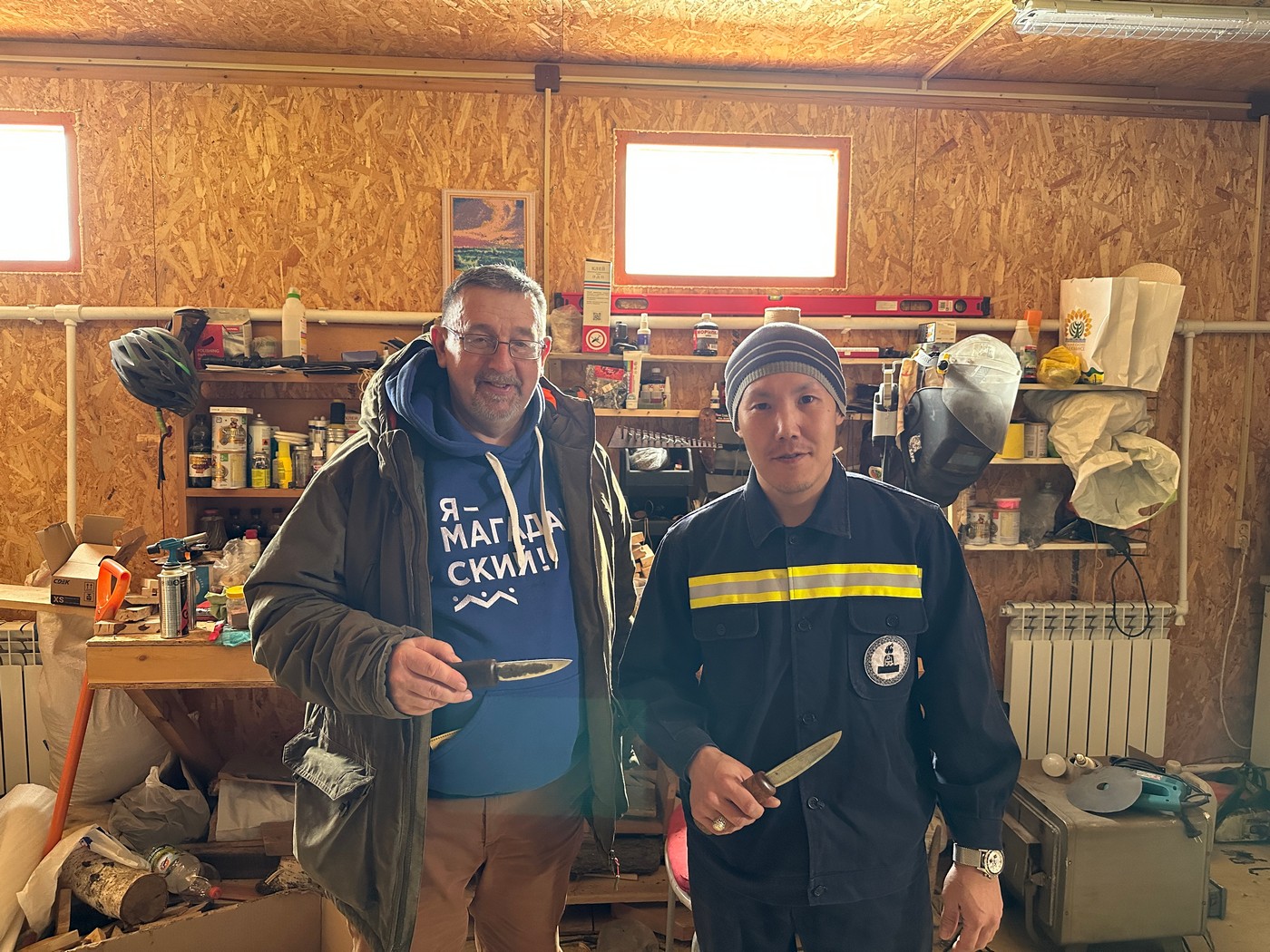 Потом я встречаю Айгына первого апреля на Дне охотника, который проходит в Намском улусе, в селе Кысыл Сыр. Там проводят ежегодное соревнование среди охотников «Байанай» и параллельно с этим соревнованием – конкурс кузнецов Республики Саха, как организатор и жюри. Кстати, мне очень понравился этот конкурс, который принципиально отличается от привычных «ножевых конкурсов» на московских выставках. Оцениваются сугубо практические качества ножей.