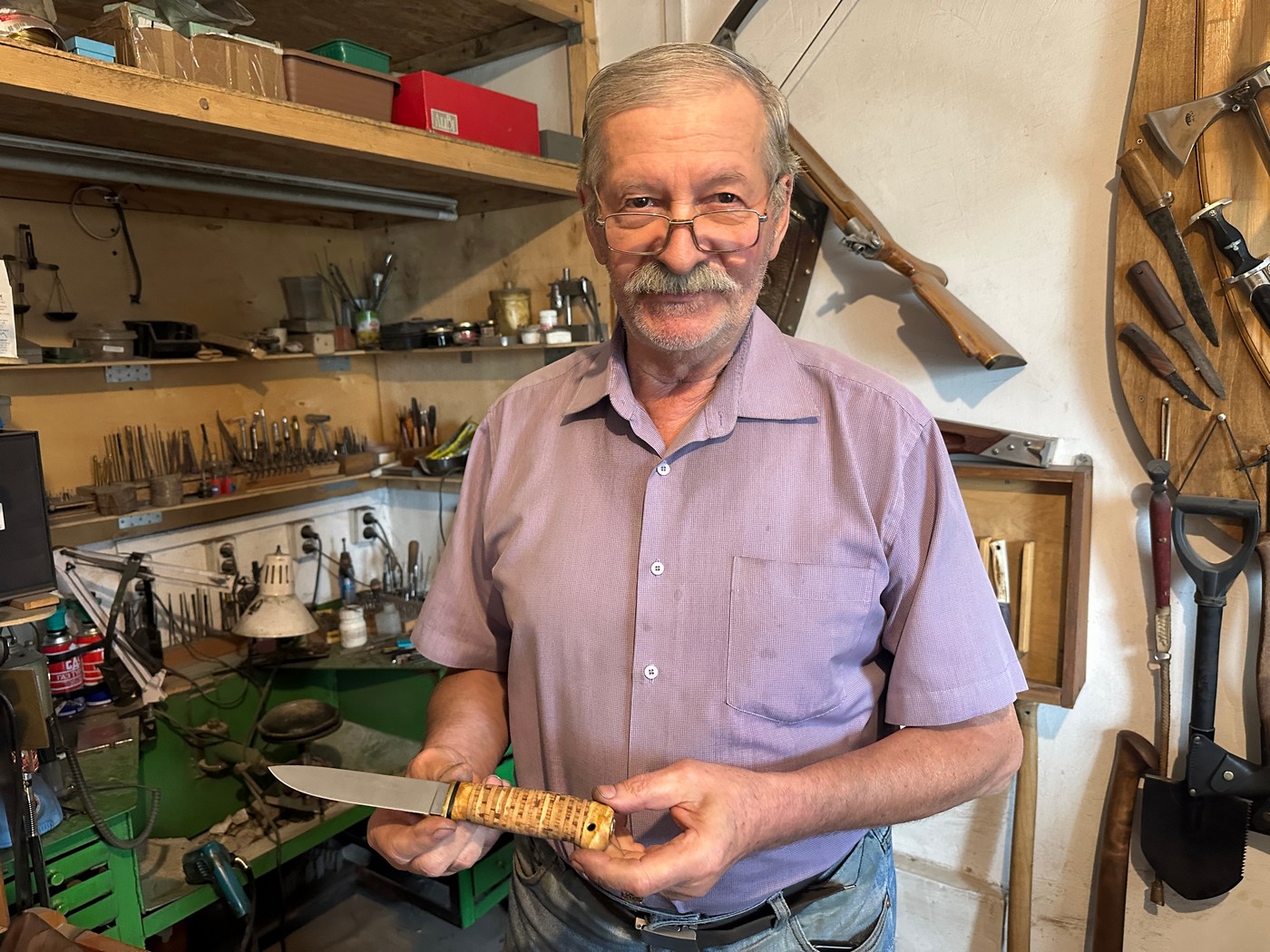 Ю. К.: Очень-очень сложно. Всё началось, конечно, с детства. Мы жили тогда на Украине, я там родился. У меня мать из Красноярска, а отец переселился ещё во времена столыпинской реформы с дедушкой в Алтайский край. После войны мать с отцом поженились и уехали обратно на Украину. Отец войну прошёл всю с 1941 до 1949 года. На Украине он в милицию устроился и служил до милицейской пенсии, гонялся за бандеровцами. В связи с этим он приносил постоянно трофеи. На каждое изделие пишет протокольчик, наваливает целую кучу: там и пистолеты, и автоматы, и ножи. А я тут маленький сижу, ковыряюсь, годика два-три мне. Потом я Кузбасский политехнический институт окончил, как инженер-механик, металловедение у нас было очень серьёзное, металл нас заставили хорошо изучить. Изучил, а потом так, между делом, попадая на практику на заводы, начал точить там ножи, в Кемерово ещё. Я в Красноярск-то переехал в 1976 году, после окончания института.