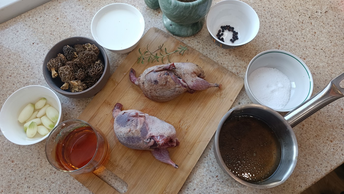 И это не удивительно: весенняя охота на вальдшнепа часто совпадает с появлением этих деликатесных грибов. Чаще всего сморчки играют роль ключевого ингредиента соуса, который подаётся к поджаренному вальдшнепу (с беконом или без оного). В непосредственном приготовлении самой тушки они не участвуют. Однако в предлагаемом рецепте я предлагаю поступить иначе.