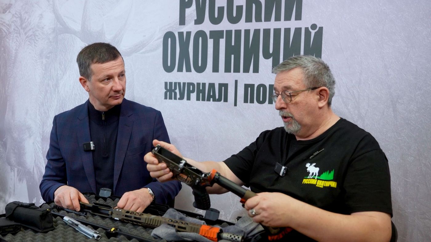 Алексей Голубев, основатель и директор компании Союз-ТМ, представляет Михаилу Кречмару, главному редактору «Русского охотничьего журнала», новую винтовку системы AR - Profi Hunter.